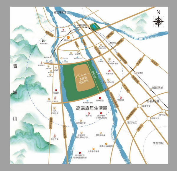 本招商项目香颂湖国际社区位于成都市都江堰市青城山镇,由成都香颂置业发展有限公司投资开发建设,公司成立于2007年3月12日,注册资本50639万元。项目位于世界双遗产、国家5A级风景区都江堰——青城山风景区,紧临800亩翠月湖公园,距青城山高铁站8公里,总占地面积近1200亩,建筑面积逾50万㎡,规划可容纳2500户业主,是青城山下规模最大的中高端社区。