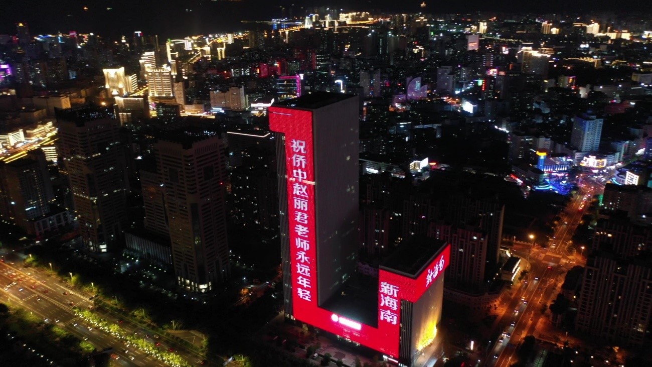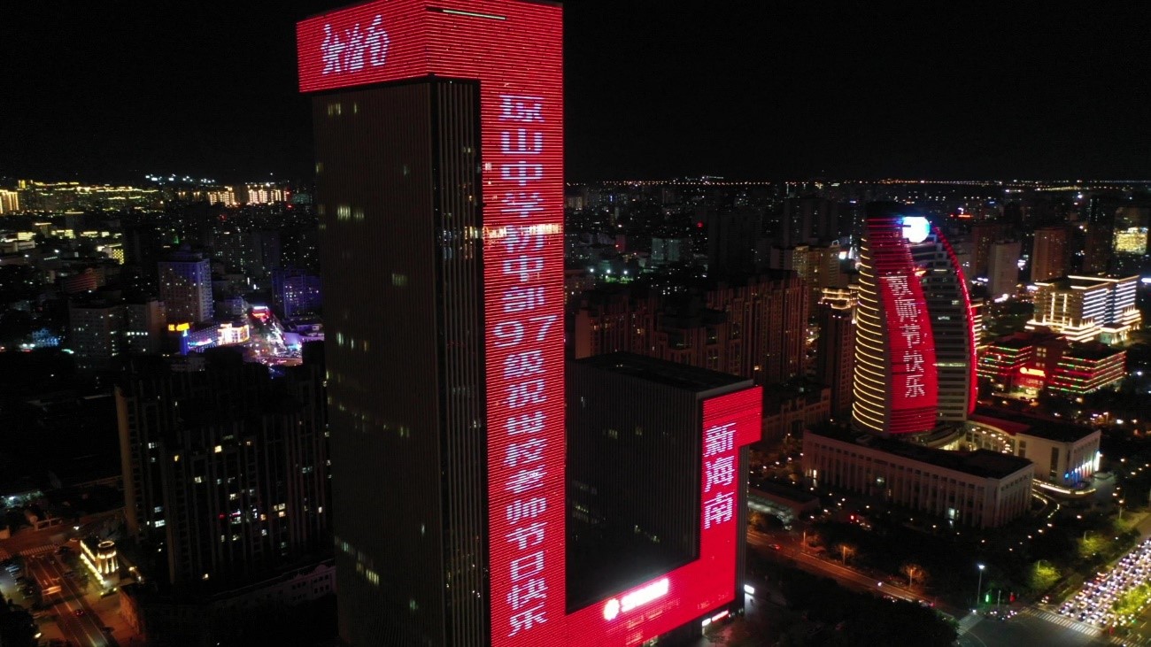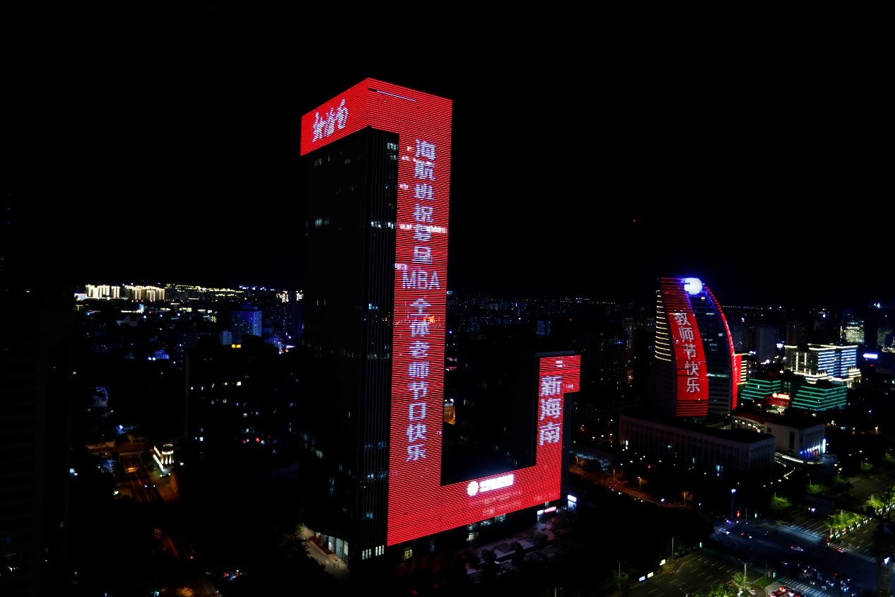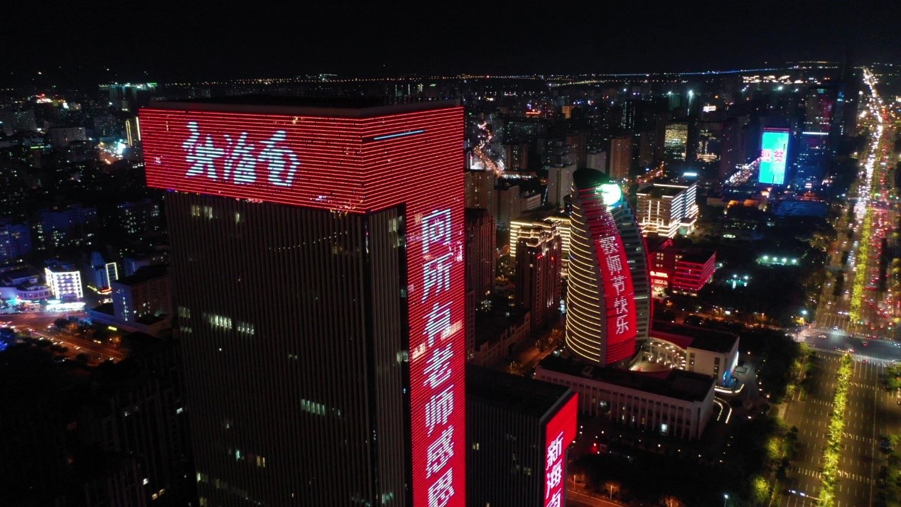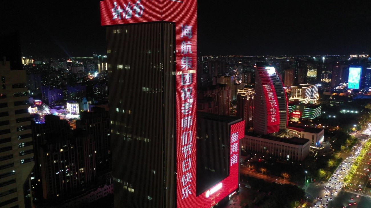 当晚,海口大英山CBD楼宇群亮起景观灯,海航大厦、海南大厦化身表白墙,持续打出“教师节日快乐,您辛苦了”、“海航基础祝人民教师节日快乐”等字样,照靓海口教师节夜空,用这种特殊的方式致敬人民教师。