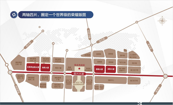 沿国兴大道的东西轴线,保留了大英山旧机场的跑道轴线;南北轴线上,以红城湖公园和日月广场为重要建筑。北侧行政区汇集海南省政府办公楼、海南大厦、互联网金融大厦、海南迎宾馆等项目;南侧文化区布局日月广场;东侧商贸区聚集海口双子塔等城市精华;西侧高端住宅区为海航豪庭高端豪宅区。四大商业金融服务中心安排各银行、保险公司、证券公司及在海南的战略投资商如航空、油汽、旅游、航运等企业总部及其办公楼,可容纳10万人办公,为该区域汇聚“金融活水”奠定硬件条件。
