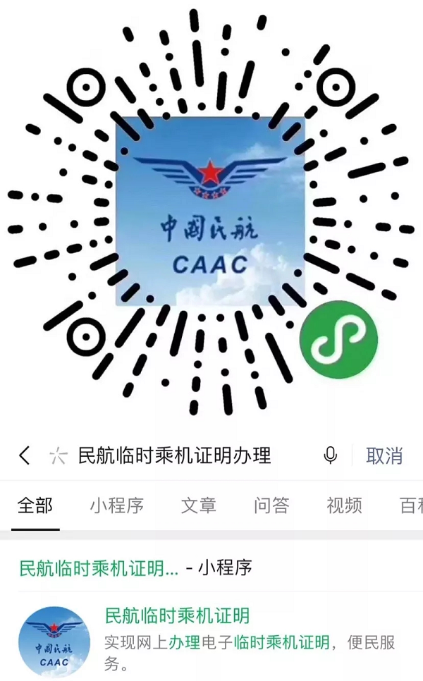 ▲旅客可通过扫描民航临时乘机证明二维码或在微信中搜索民航临时乘机证明小程序进行申报