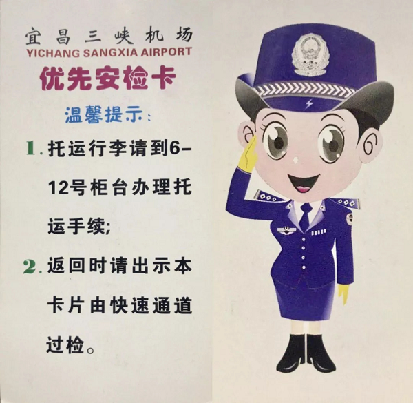 2018年三峡机场安全检查站正式推出“优先安检卡”服务。此项服务主要针对于随身携带限制用品需要托运而进行二次安检的旅客。持此卡的旅客在二次过检时,不需要重复排队再次等待安检,可向安检现场工作人员出示“优先安检卡”后通过相应通道优先进行安全检查进入候机隔离区。目前三峡机场每天约有40人次旅客使用到该服务。