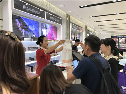 伴随着“滴滴滴”的扫码声和“哒哒哒”的键盘输入声,海口机场免税店香化区的收银员李夏快速而准确地为旅客办理免税品收银买单。