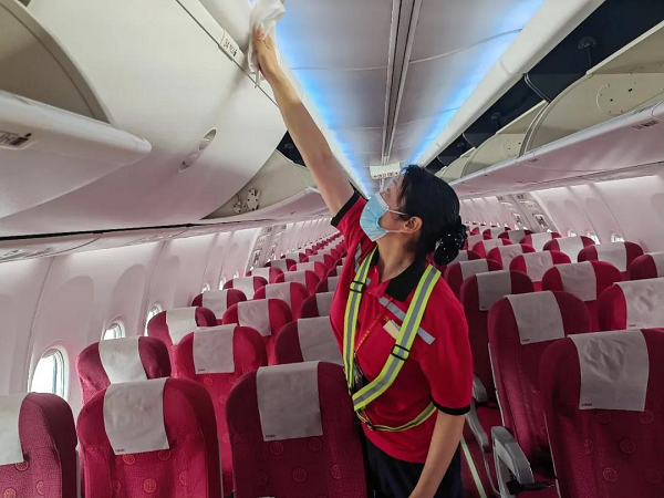 疫情防控常态化下,在保障往返国际及风险地区航班时,清洁队员们仍需穿着防护服及佩戴防护口罩,而在此时,客舱不会打开空调,相对密闭的客舱空间中温度高达40℃,队员们往往刚进入客舱就已经汗流浃背。
