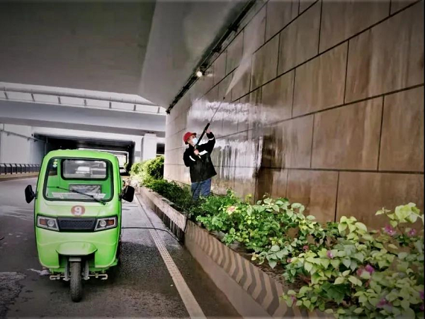 刘文磊是海航物业驻美兰机场环卫主管,主要负责机场周边的环卫工作。由于美兰机场高架桥周边区域正在扩建,加之暑运来临,车流量增多,飞扬的尘土粘附于路边墙面及绿植,刘文磊需要用高压水枪对这些地方进行每周2次清洗。对于较顽固的污渍,光用高压水枪喷洗是远远不够的,刘文磊还需要亲手来回擦拭以去除顽固污渍,保证墙面干净整洁。