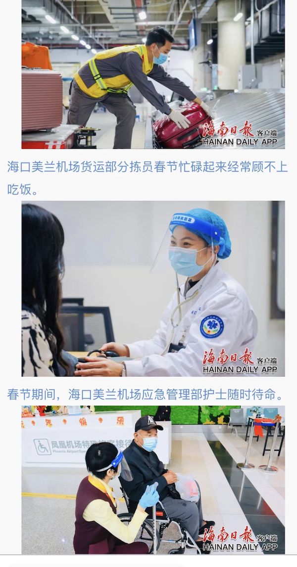 归乡和来琼的旅客,与家人团圆、欣赏美景、欢快游玩的背后,离不开海南机场万名一线员工的坚守,一幅幅工作画面记录了海南机场人春节期间最美的身影,他们在平凡的岗位绽放出不平凡的光芒。人民网海南频道首页、海南日报等对《海南机场人的平凡坚守》进行专题摄影报道。