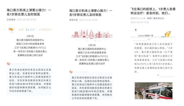 2月3日大年初三,美兰机场接到三沙机场紧急来电,三沙飞往海口的航班上有一名年仅1岁的吸入性肺炎患儿急需转运至海口进行治疗。两机场快速响应,高效联动,成功将患病儿童转运至海口医院,争取了宝贵的治疗时间。文明海南、中国新闻网、海南日报、海南电视台等纷纷对事件进行了报道。