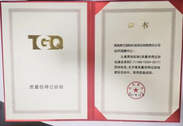 近日,海口美兰国际机场货运部(以下简称“美兰货运”)凭借“敬畏规章、安全启航”班组建设成果荣获由中国质量协会颁发的“全国质量信得过班组”奖项,标志着美兰货运质量信得过班组建设以及现场服务管理水平得到了业界的高度认可,这也是美兰货运自2020年以来,连续两年获此殊荣。