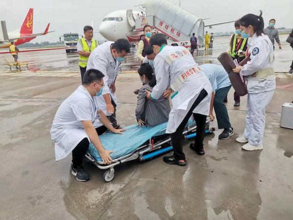 9月25日,一架由昆明飞往潍坊的DR6591航班,机组告知潍坊机场塔台航班上一名孕妇突感身体不适,申请优先落地。接到该消息后,潍坊机场立即启动医疗救护应急预案。医务人员第一时间登上飞机进行健康码查验、体温检测,机场各保障人员迅速出动、无缝衔接,交由医院急救人员。救助、转运全程仅用时5分钟,为孕妇旅客的救治争取了时间。