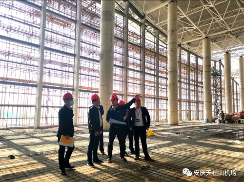 10月17日上午,安庆机场董事长兼总经理史美康带领经营团队及各部门负责人一行8人,深入新建航站楼施工现场进行实地勘察。