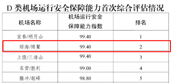 近日,中国民用航空局完成了机场运行安全保障能力首次综合评估,从安全管理体系建设、安全投入、安全运行问题及整改、安全信息报送等方面,对2021年在用的247个运输机场去年下半年评估情况进行通报。参与此次评估的D类机场(年旅客吞吐量<200万人次)共计168个,博鳌机场获得D类机场综合排名第一名(并列)。