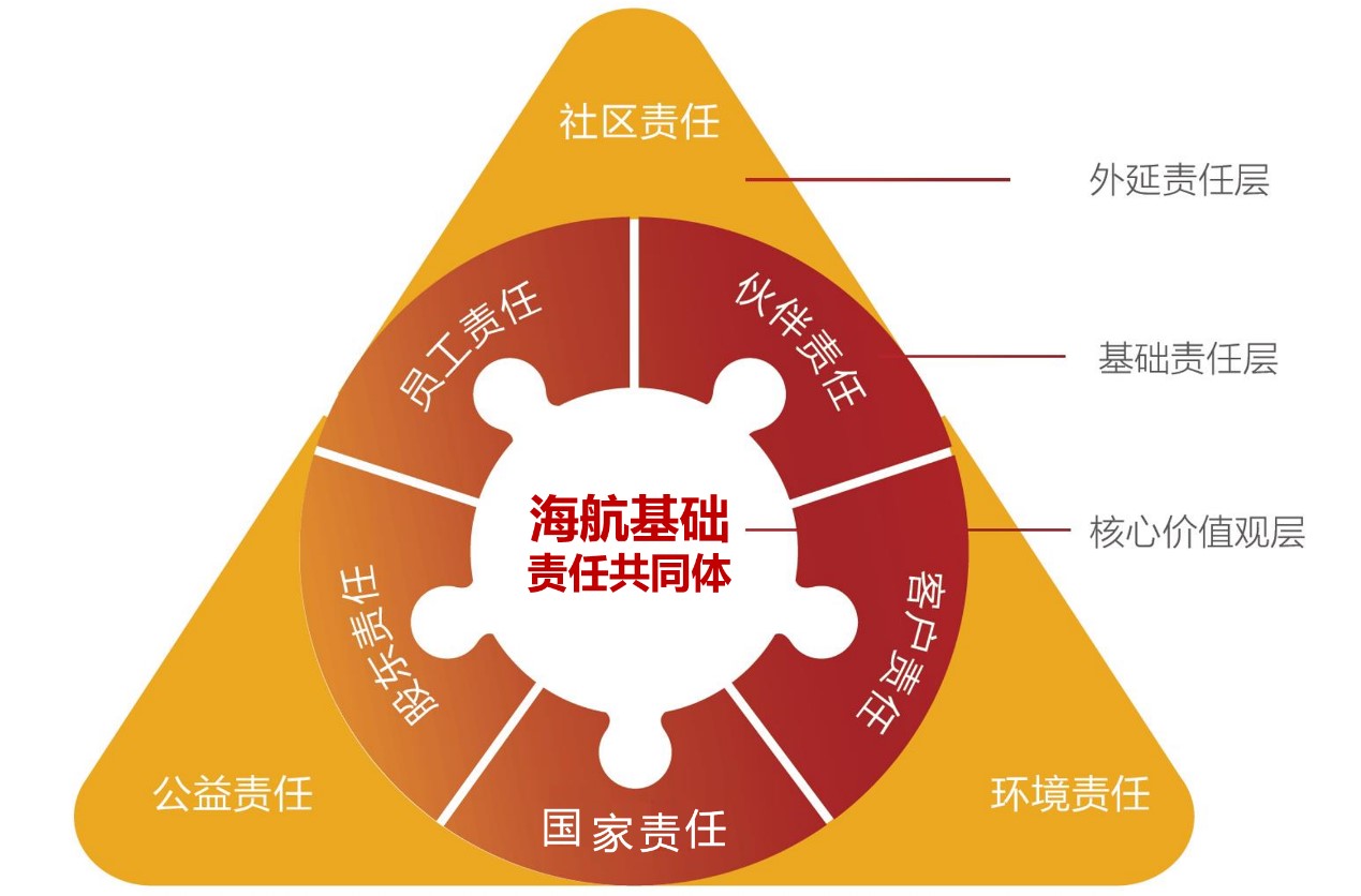 今年,海航基础提出了“责任共同体”模型,期望通过公司在股东责任、员工责任、客户责任、伙伴责任、国家责任等基础责任层及环境责任、社区及公益责任等外延责任层作出公司应有的贡献。