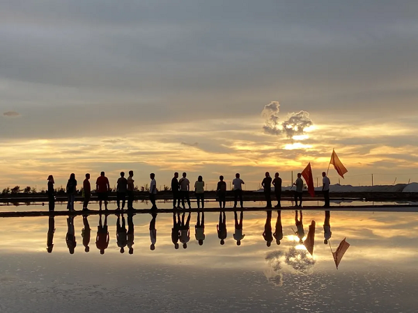 自皑皑“盐山”,到盐文化馆,这是几代盐场人走了无数次的路。2.5公里,只是这漫漫长路的一小部分,沿途一望无际的盐田让党建小组的员工们啧啧称奇。夕阳西下,澄澈的天空倒映在了盐田,真真让人明白了这里为什么被称为“天空之镜”。不知道开荒拓土的“盐一代”们,在劳累了一天后,拖着沉重的脚步走在这条路上时,还有没有力气去欣赏这美丽的夕阳。但同先辈们一样的,是奋勇前进的脚步。