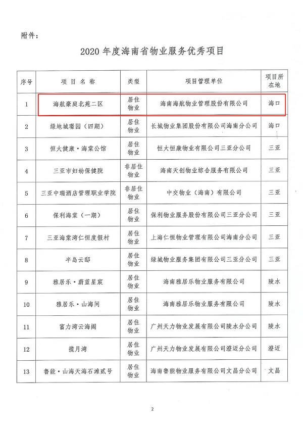 12月31日,海南省物业管理协会公布“2020年海南省物业优秀服务项目”评选结果,海航物业海航豪庭北苑二区项目继2018年获得“海口市物业服务优秀小区”后再创佳绩,荣获2020年度“海南省物业服务优秀项目”称号。