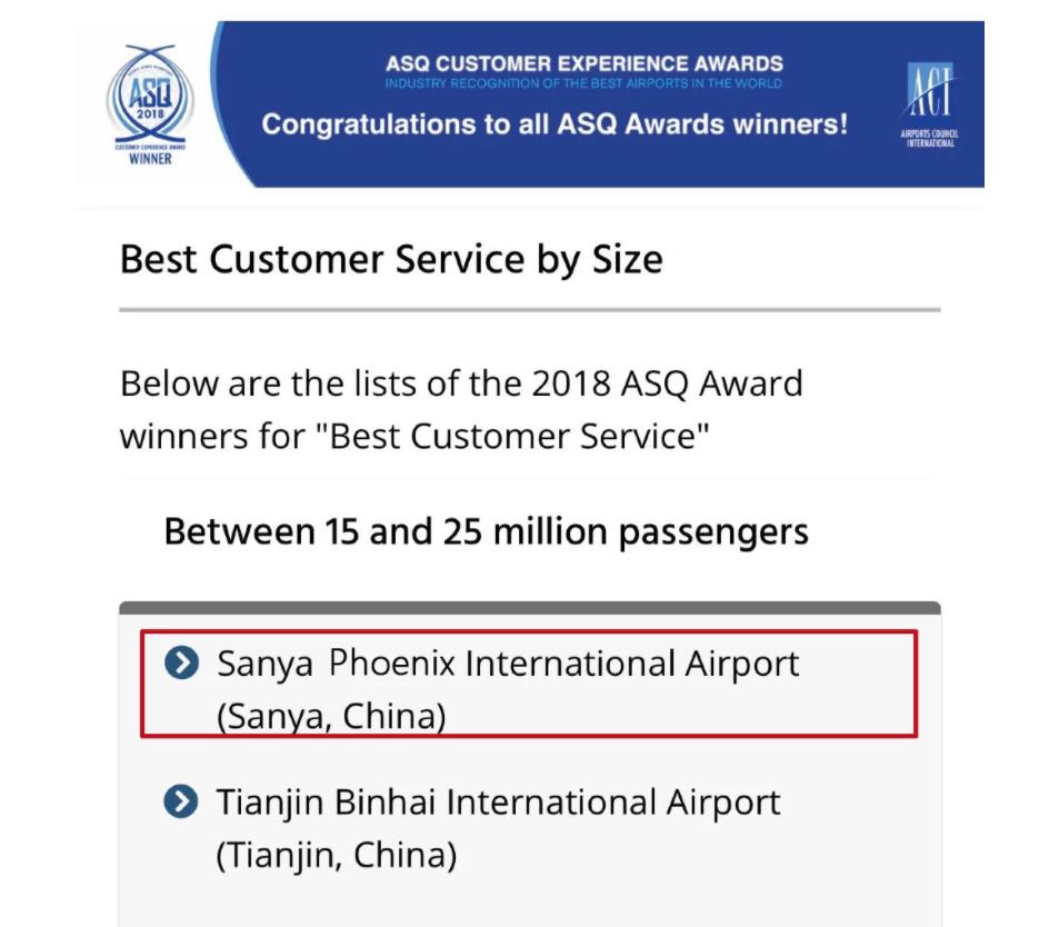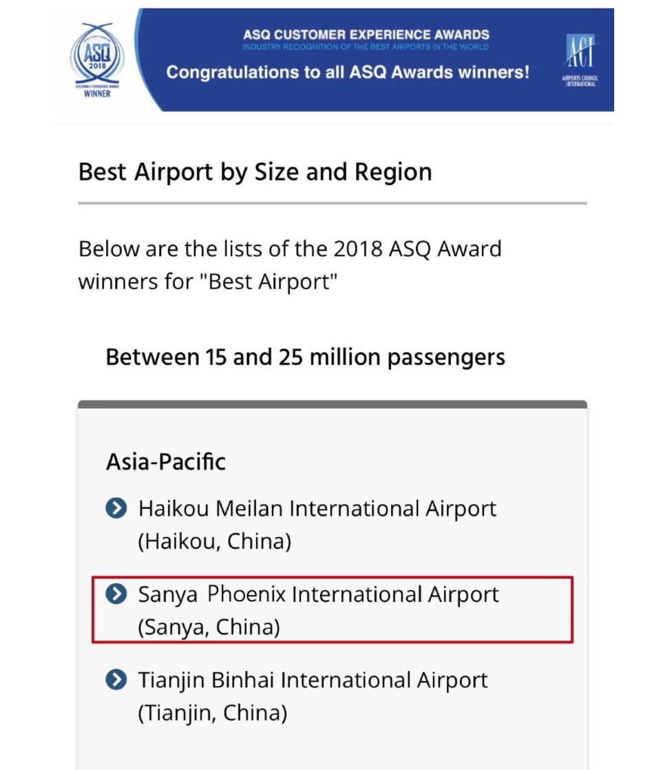 中国民航网 通讯员黄治平、陈求武 报道:当地时间2019年3月6日21:00(北京时间3月7日10:00),国际机场协会(AirportCouncilInternational,简称“ACI”)通过其官方网站对外正式发布了2018年度全球ASQ旅客满意度年度大奖获奖名单,三亚凤凰国际机场(以下简称“三亚机场”)凭借优质的旅客服务荣获国际机场协会(ACI)2018年度1500-2500万量级机场“亚太区最佳机场”及“最佳客户服务机场”两项世界大奖。这是三亚机场推进国际品牌建设以来取得的又一优秀成果,标志着三亚机场服务品质得到了国际权威机构及广大旅客的高度认可和充分肯定。