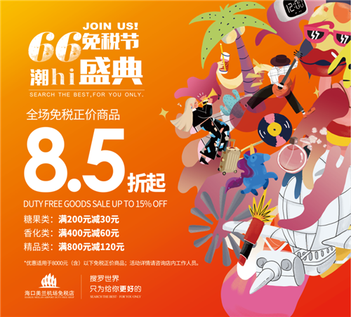为让旅客足不出国即可购买到更为优惠的国际大牌商品,感受海南国际旅游岛魅力,海口机场免税店于2016年举办首届“6.6免税节”。今年海口机场免税店“6.6免税节”以“潮HI盛典”为主题,推出更大力度的优惠折扣,为消费者打造潮流时尚购物盛宴,助力海南国际旅游消费中心建设。